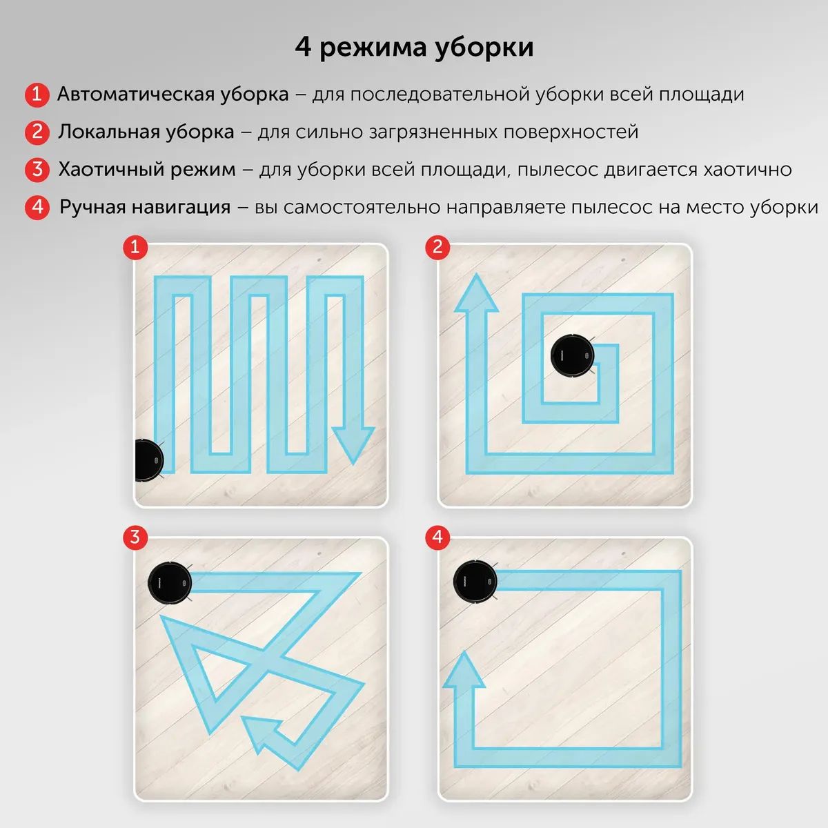 - Хаотичная уборка; Полностью автоматическая уборка; Местная уборка
