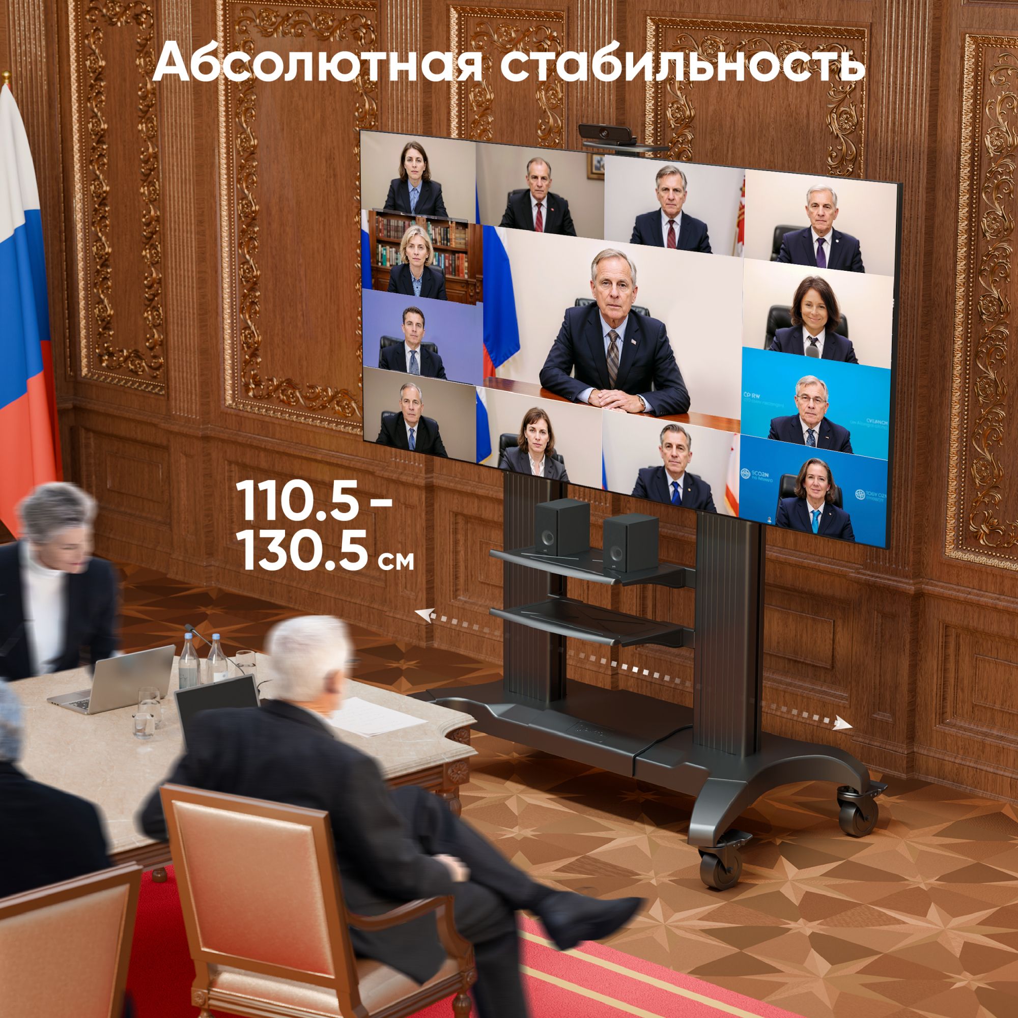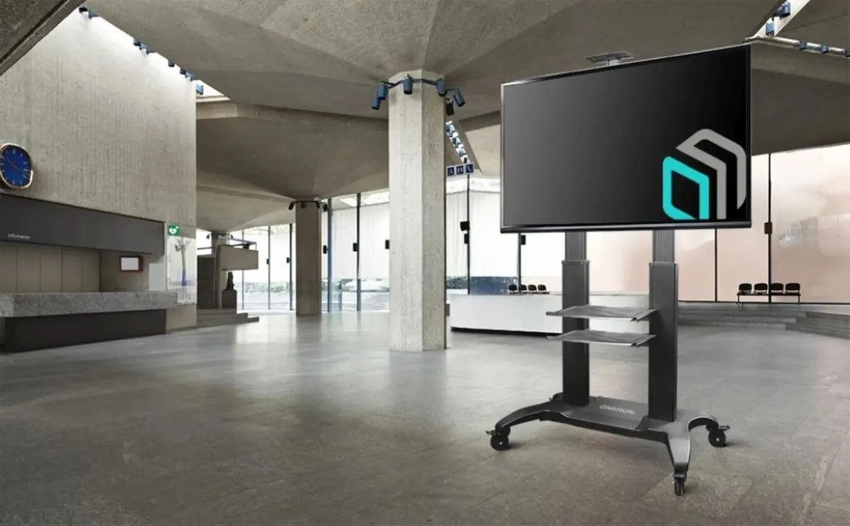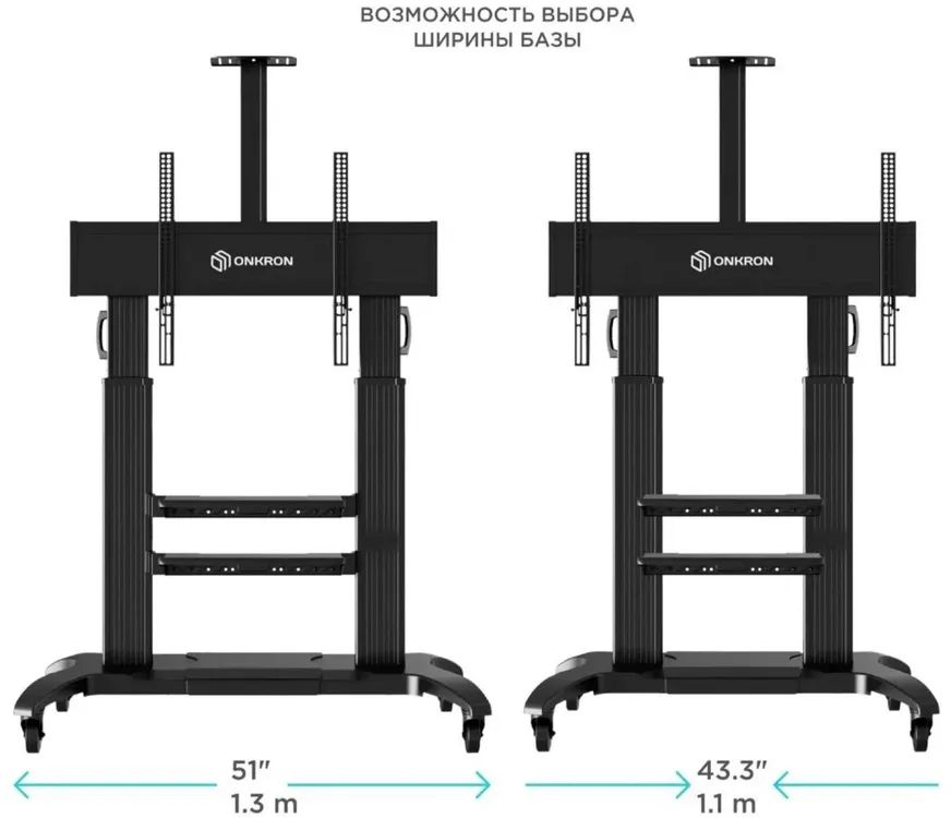 - Раздвижное основание. Различные варианты крепления VESA. Инновационная конструкция. Встроенный кабель-канал .Полка для дополнительной техники. Надёжные колёса с системой фиксации. Материал: основание, VESA-панель, полка - сталь колонны - алюминий