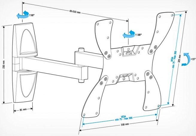 - угол наклона и поворота ТВ меняется движением одной руки