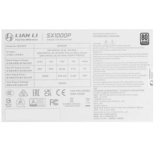 Блок питания Lian Li SX1000P / White / ATX 3.1, 1000W, 80 PLUS Platinum, PCIe 5.1, APFC, 120mm FDB Fan, Fully Modular / G9P.SX1000P.W000.RU
